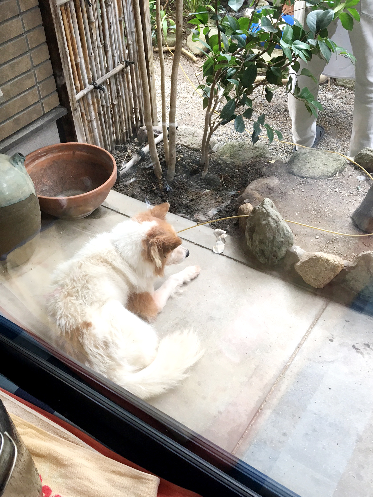 おあずけはワンコには辛いです。(右はクレープ生地のお好み焼き制作中)
